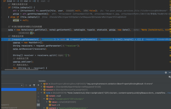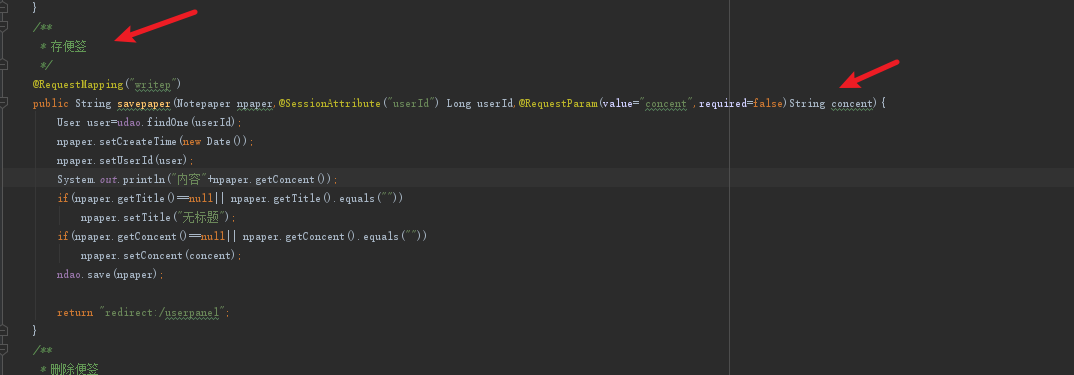 这是 Java Web 应用程序中用于保存“便签纸”对象的方法。它似乎正在使用 Spring MVC,因为它具有基于注释的请求映射和会话属性。