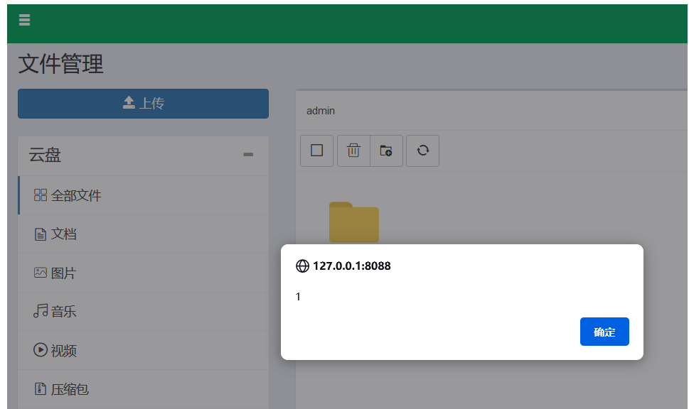 访问上述功能,点击新建文件夹,输入文件夹名为XSS验证语句<img src=1 onerror=alert(1) />,如下图所示: