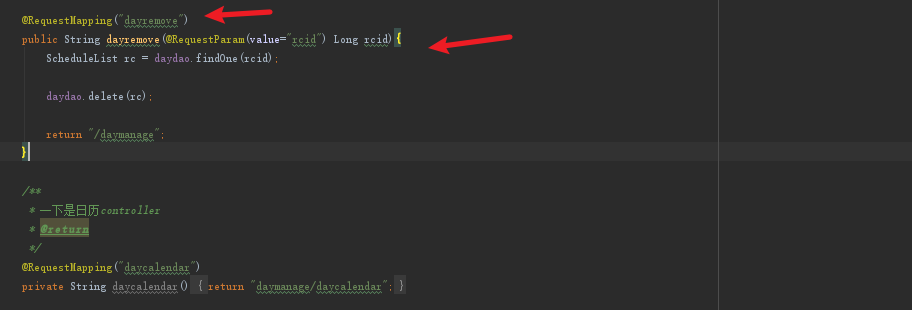 通过日程删URL中的dayremove,可以定位到日程删除位于src\main\java\cn\gson\oasys\controller\daymanage\DaymanageController.java,第204-211行,如下图所示: