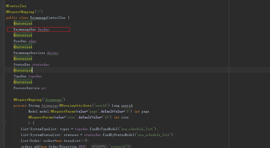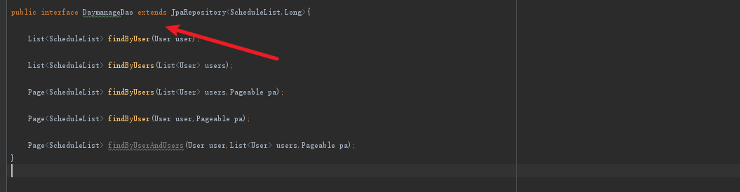 ①、从上面可以看到,使用了daydao.findOne(rcid),来操作rcid,查看daydao发现来自DaymanageDao,如下图所示:
