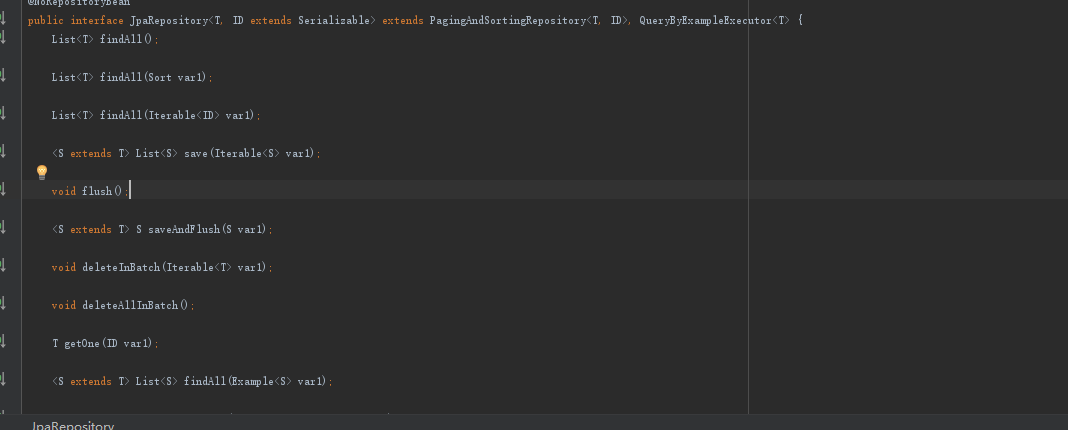 ②、进入DaymanageDao,发现并没有findOne,发现DayManageDao继承了JpaRepository,而进入JpaRepository之后也未发现findOne,但发现它继承了QueryByExampleExecutor,而findOne就在这里面,如下图所示: