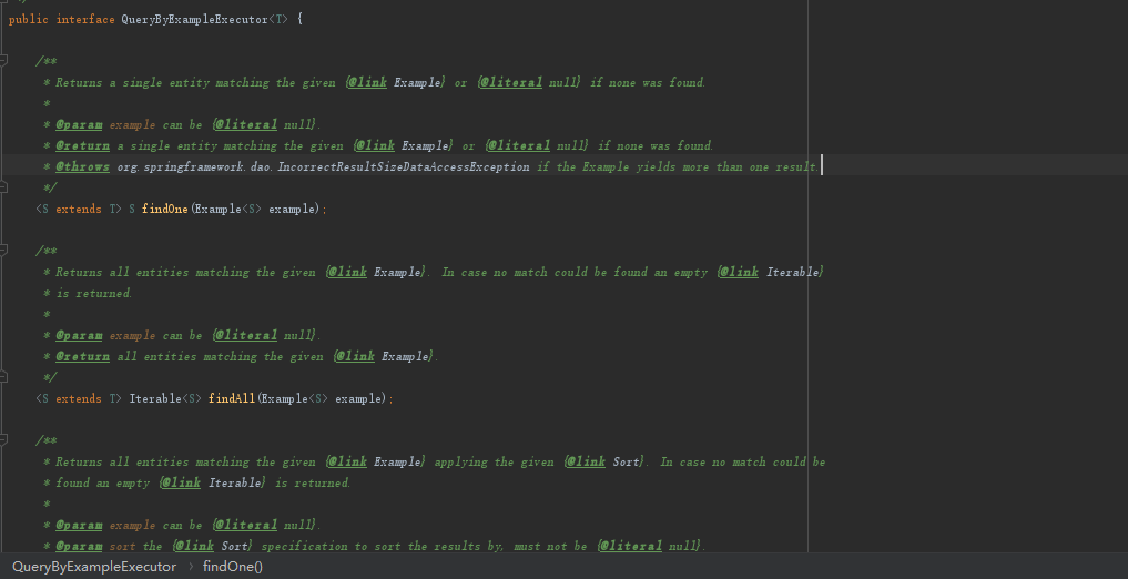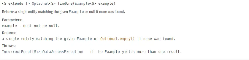 此时大家应该发现JpaRepository和QueryByExampleExecutor代码属于引入依赖的代码了,这两个代码来源自Spring Data,其中findOne是其中一个方法,具体意思如下