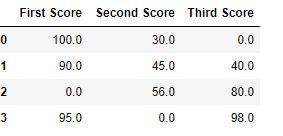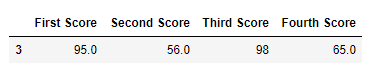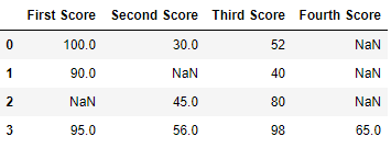 'Fourth Score':[np.nan, np.nan, np.nan, 65]}