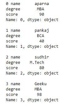 为了对行进行迭代,我们可以使用三个函数iteritems(), iterrows(), itertuples()。这三个函数将有助于对行进行迭代。
