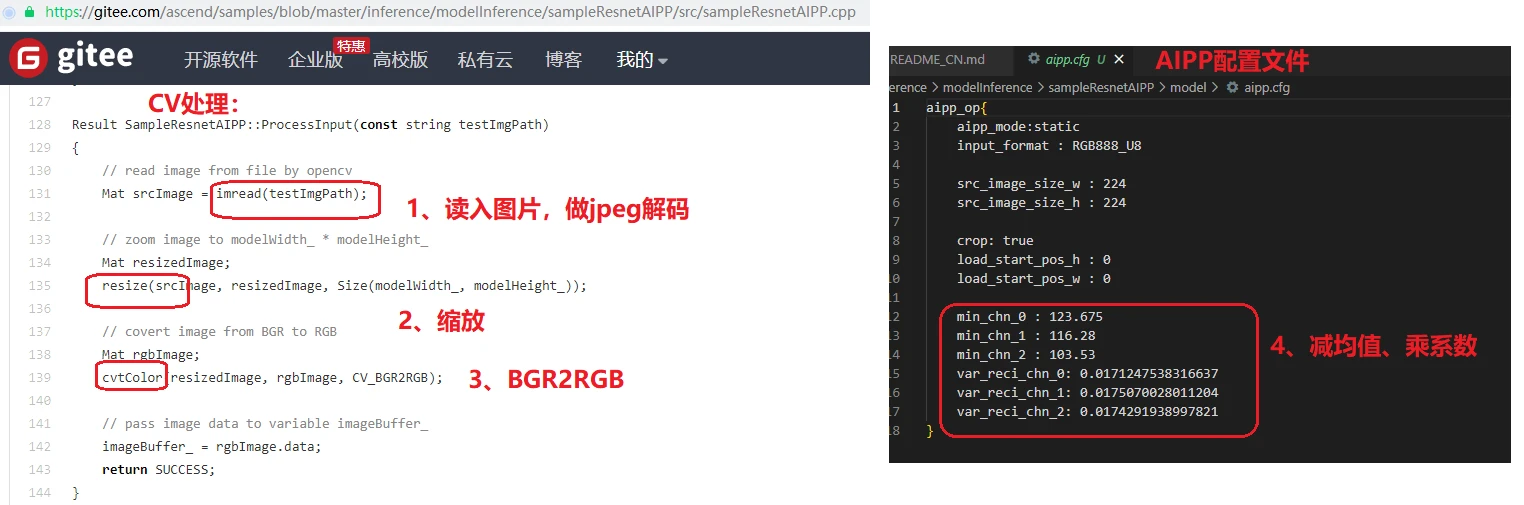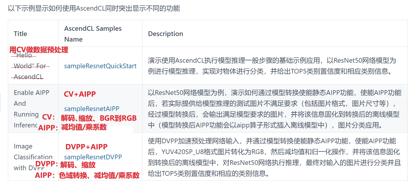 本次训练营,勤劳的小虎老师贴心的给大家准备了三种方式,供大家学习和掌握。代码在:https://gitee.com/ascend/samples/tree/master/inference/modelInference。分别是:纯open CV;CV+AIPP;DVPP+AIPP。如下表所示: