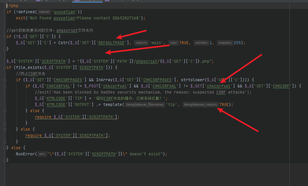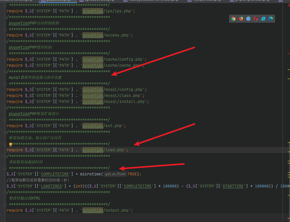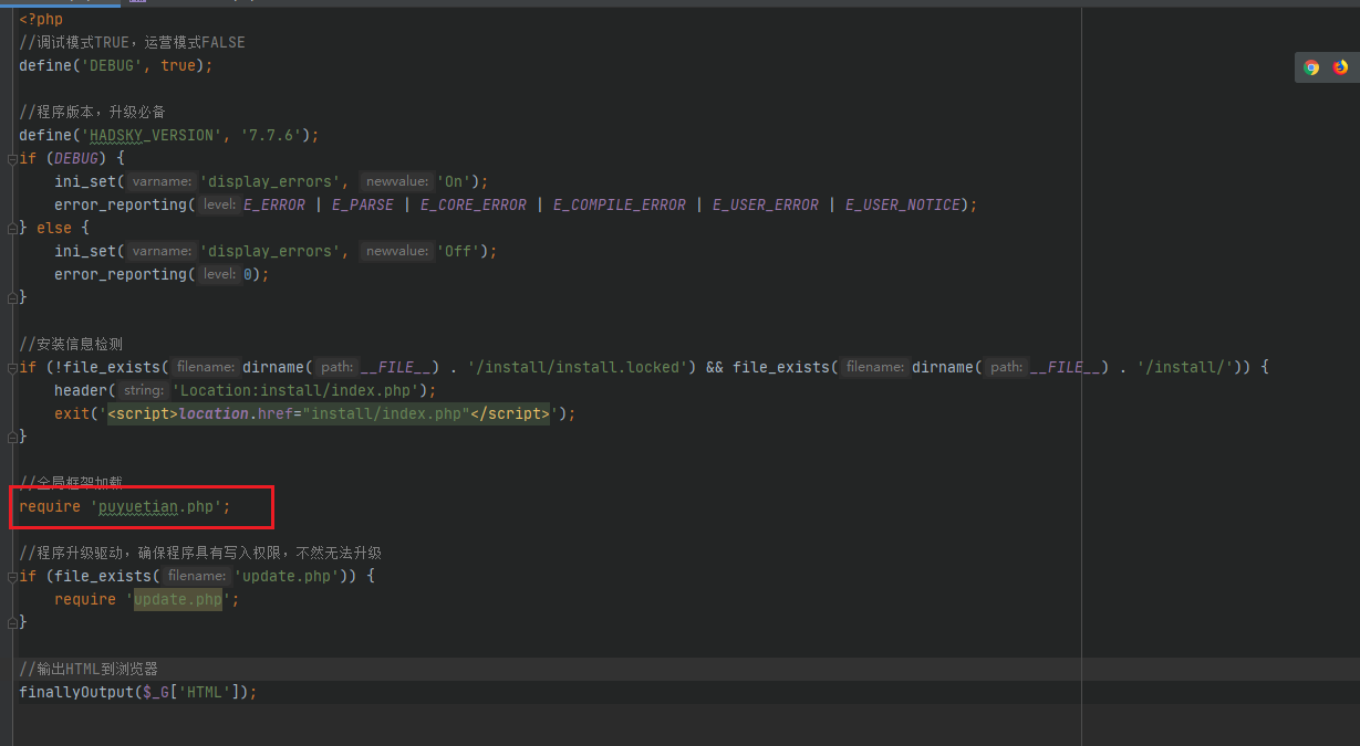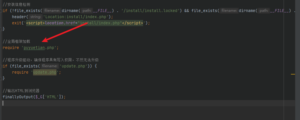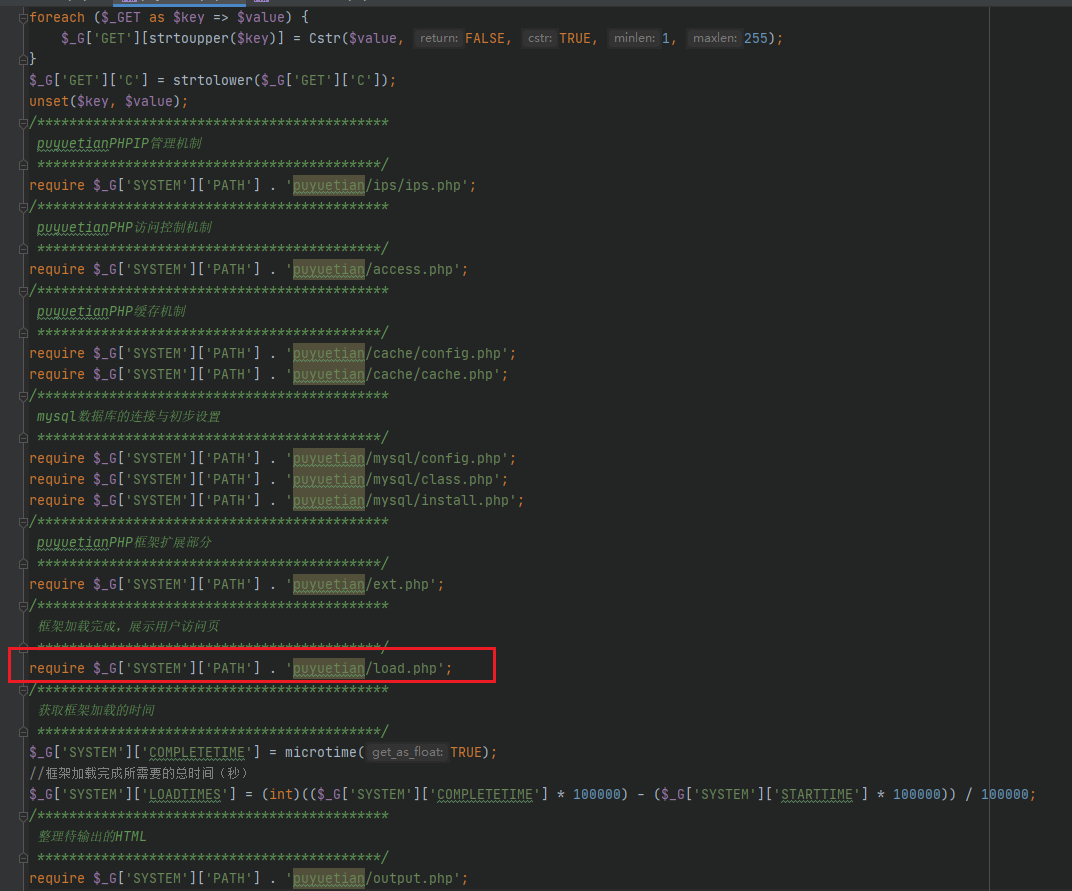 index.php中上面是一些环境检测代码,这里包含一个框架加载文件puyuetian.php,我们跟进看看: