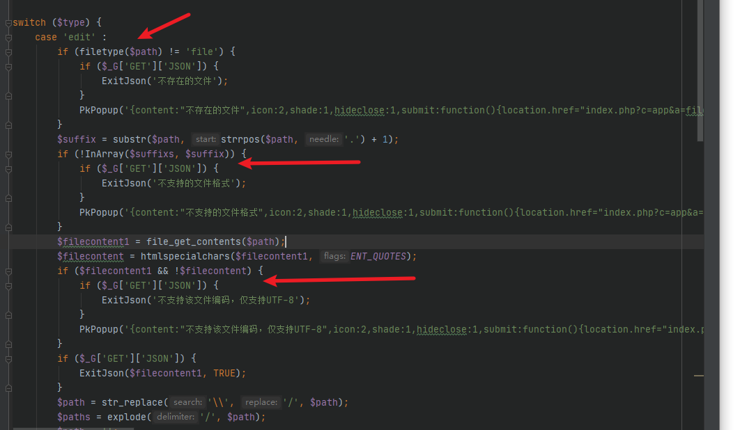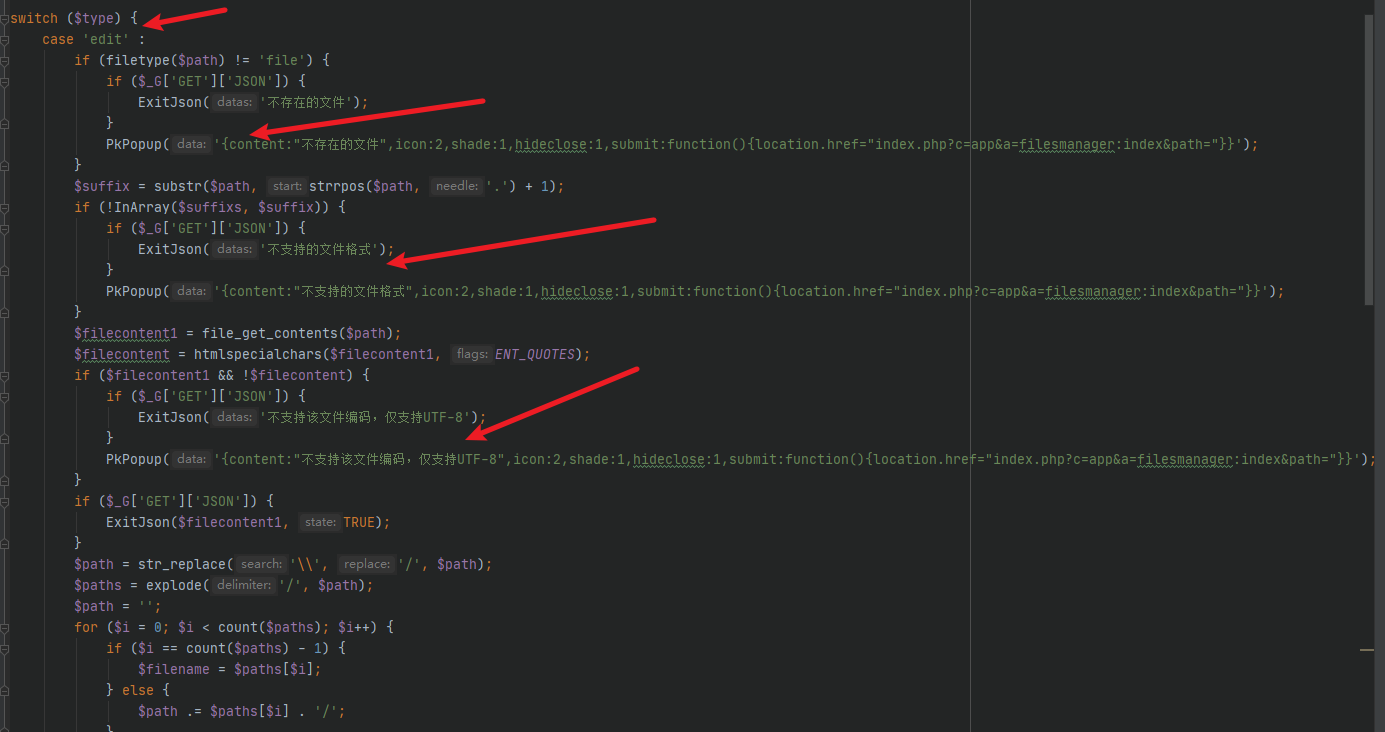 传入type=edit走到这个分支,这里白名单后缀已经可以满足我们读取大部分文件,path可控,这里只差