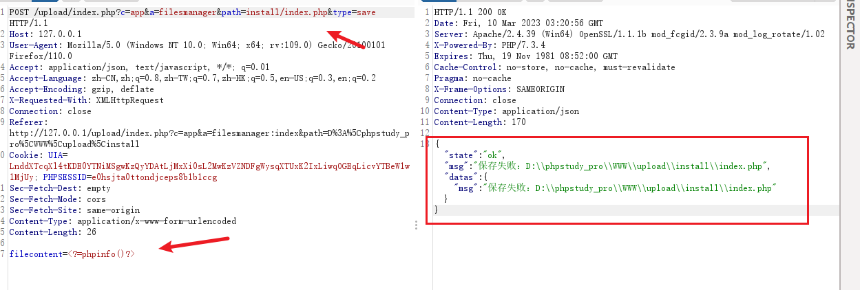 我们构造路由进行测试,这里我们找一个install目录下的文件进行测试,代码中是会提示保存失败的,
