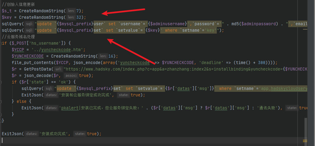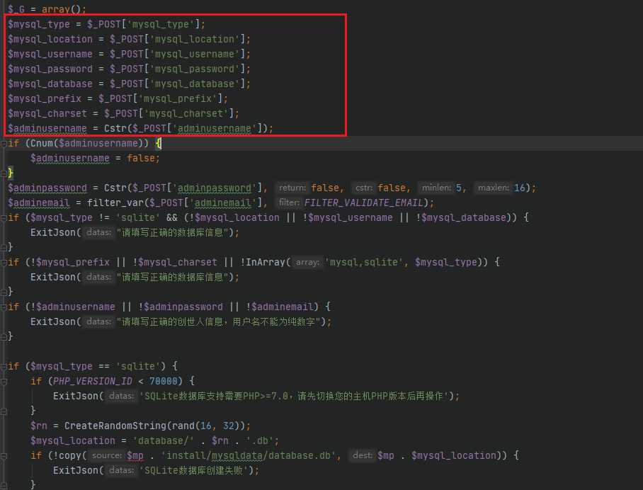 最上面接收参数,也就是我们安装时填入的一些数据库信息。