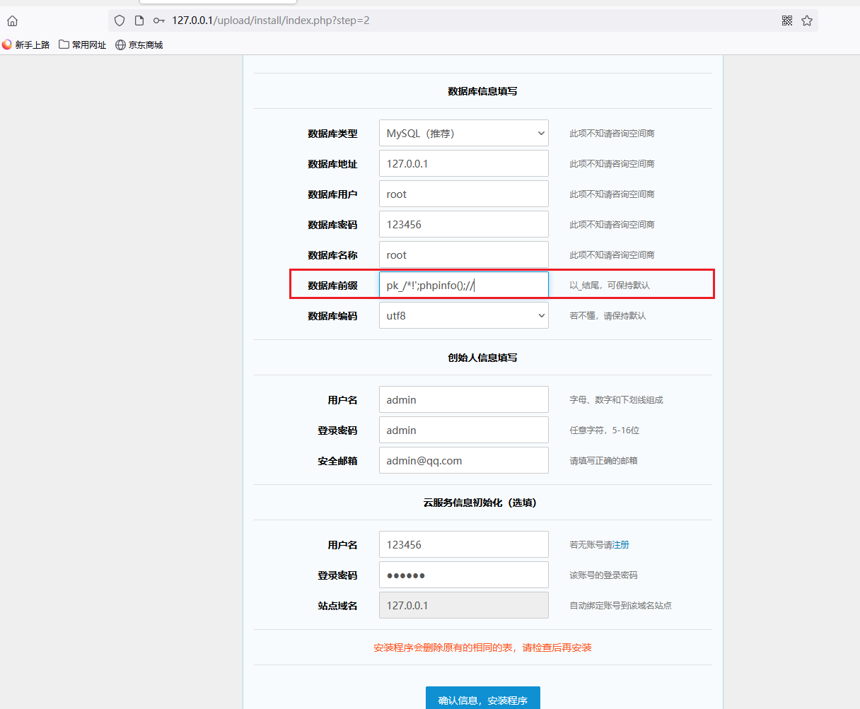 经过尝试发现只有这里的 mysql_prefix 参数也就是数据库前缀这里是可以完全控制的,其他参数如果