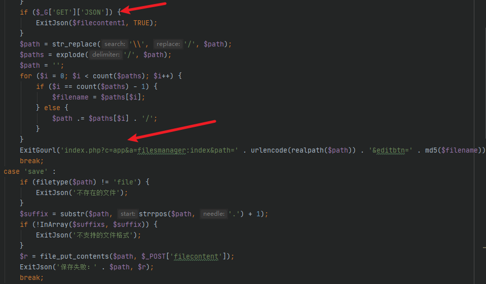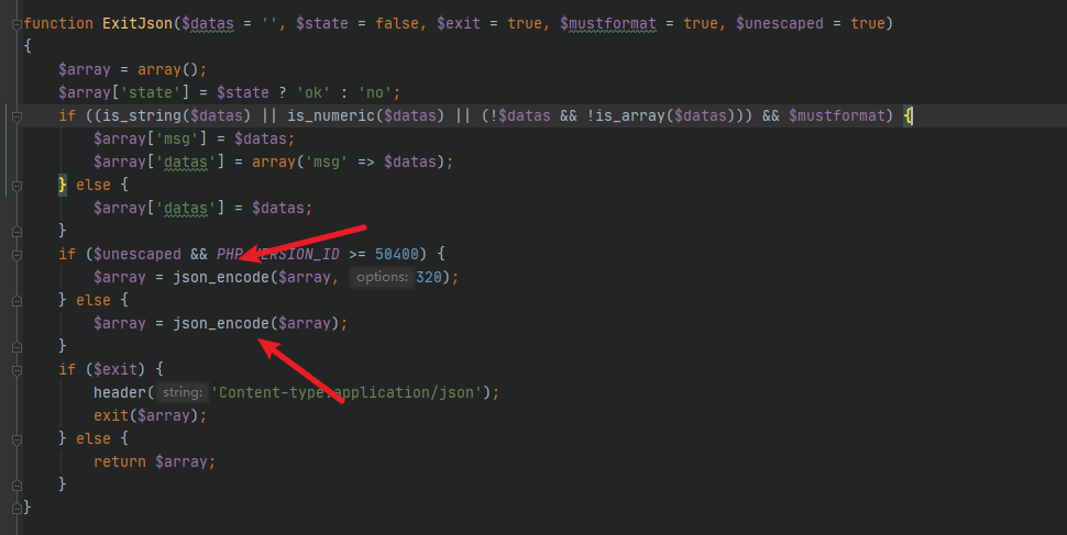 当我们GET传入json参数时,就会进入ExitJson函数中,该函数的大致意思就是将我们读取到的内容通过