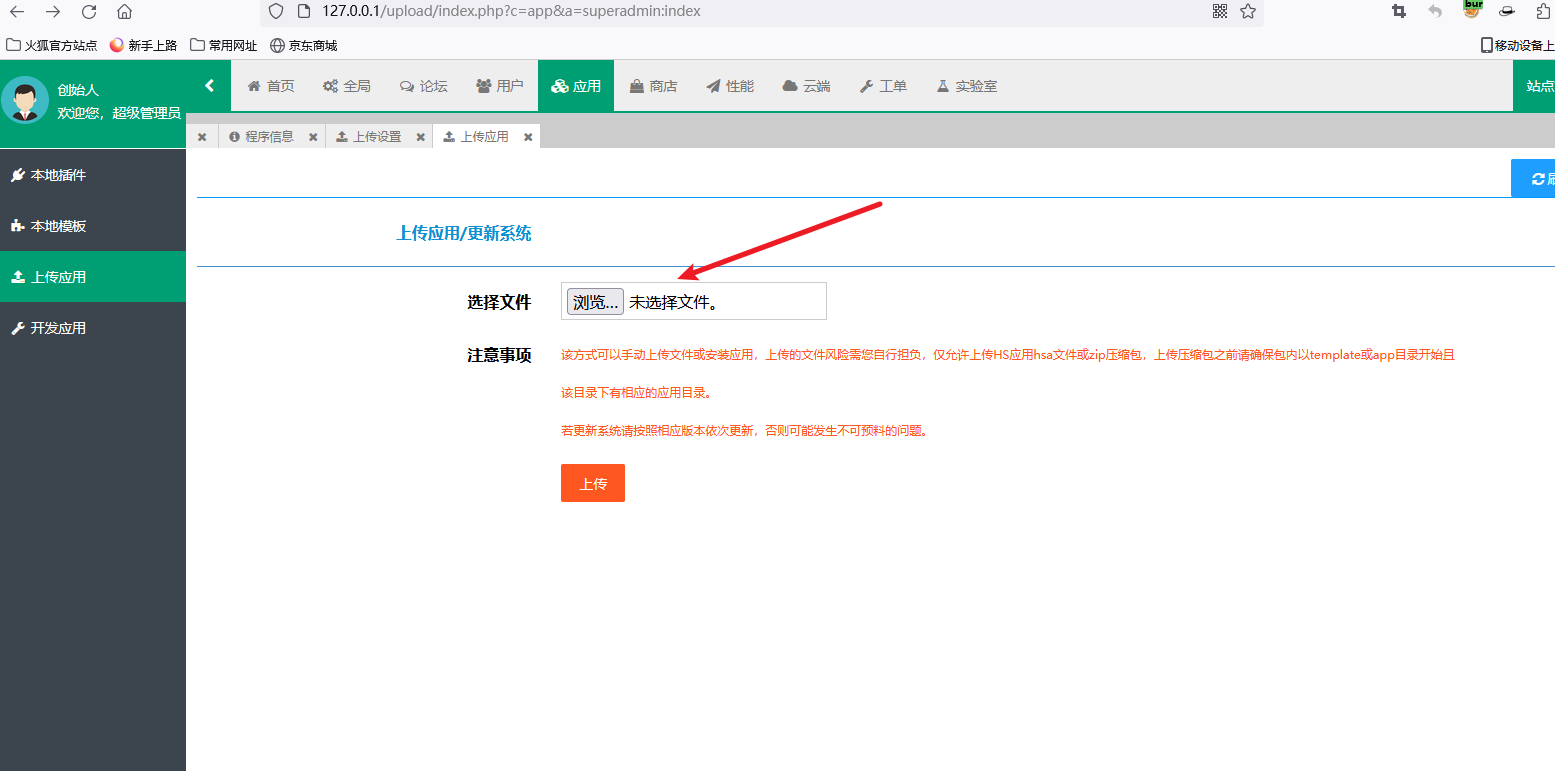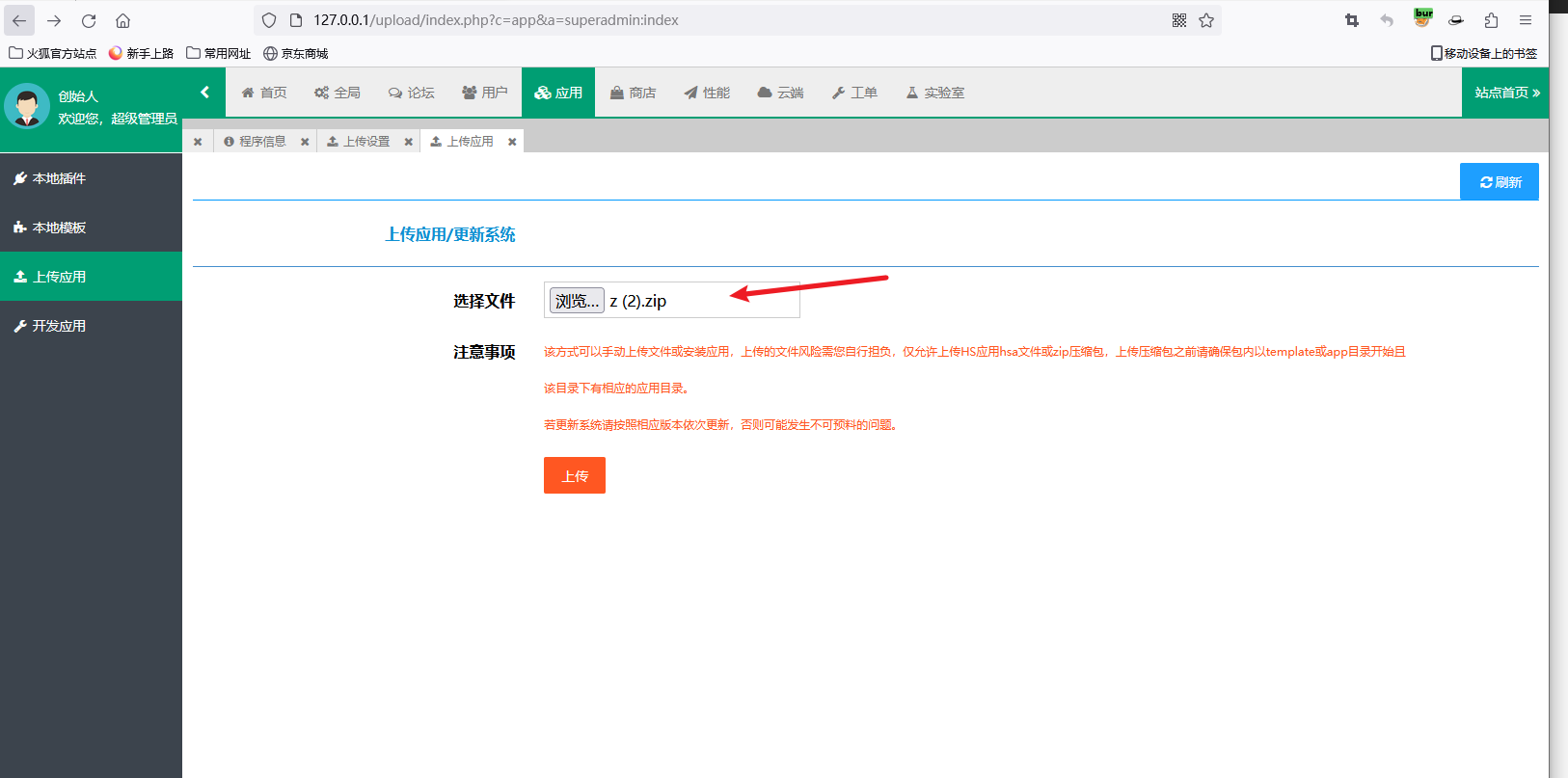 这里的上传上传应用,根据以往的经验来看的话,这里的处理流程应该是通过上传.zip压缩包然后自动解