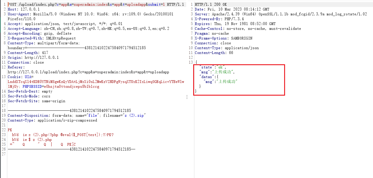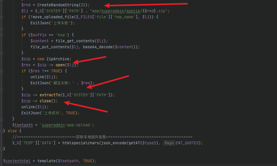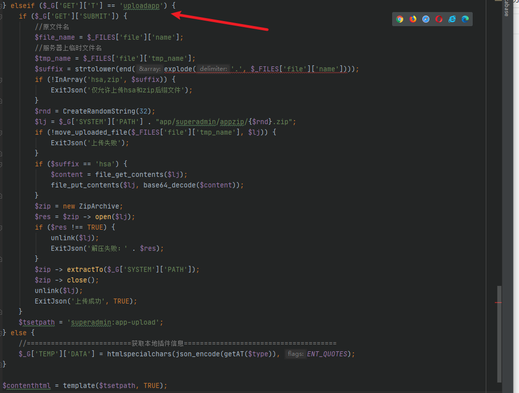 通过控制 t=uploadapp 参数来控制代码执行此处的else if,其中就是上传zip文件的代码,可以看到这里