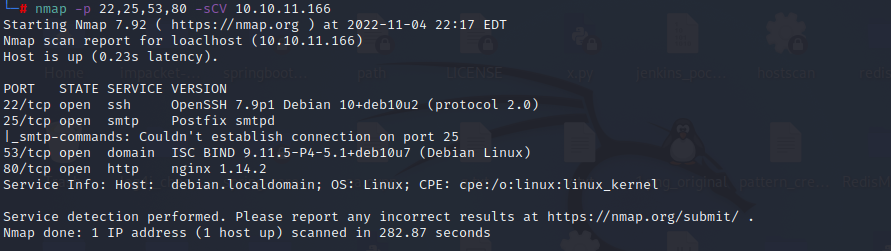 首先使用nmap对端口进行探测。找到了SSH (22) 和 HTTP (80)。2个端口。