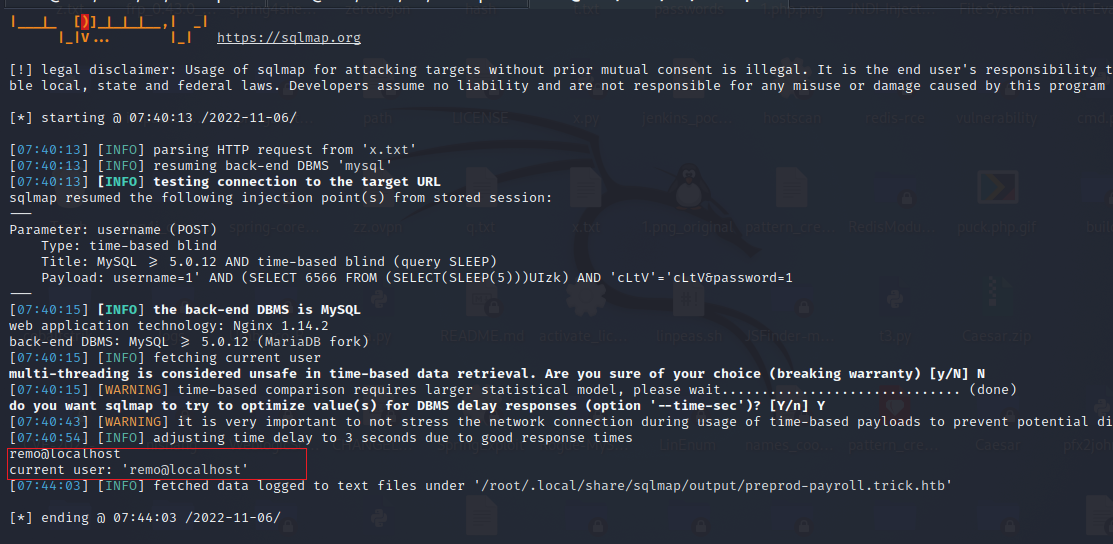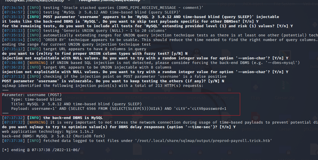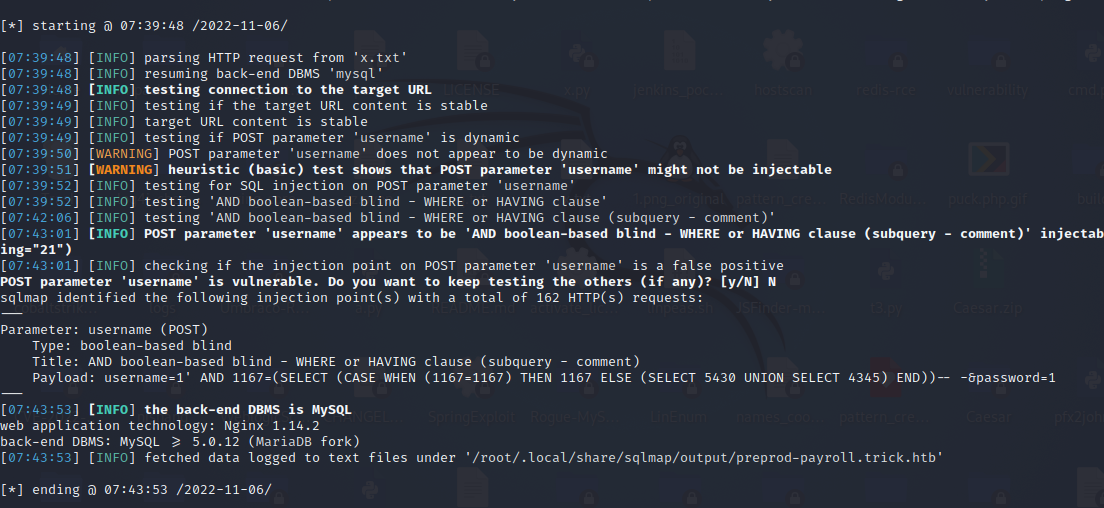 只需包含index.php类似http://preprod-marketing.trick.htb/index.php?page=index.php, as 的index.php内容将再次执行,而不是返回源代码。尝试获取源代码的一种方法是使用 PHP 过滤器。访问http://preprod-marketing.trick.htb/index.php?page=php://filter/convert.base64-encode/resource=index.php可以在包含之前进行base64编码index.php,然后只会出现base64文件。接着继续使用sqlmapap读文件--file-read=/var/www/market/index.php
