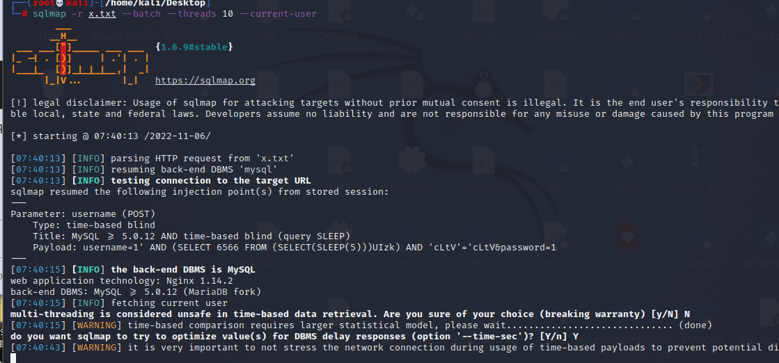 先判断注入点:sqlmap -r x.txt --dbms --batch