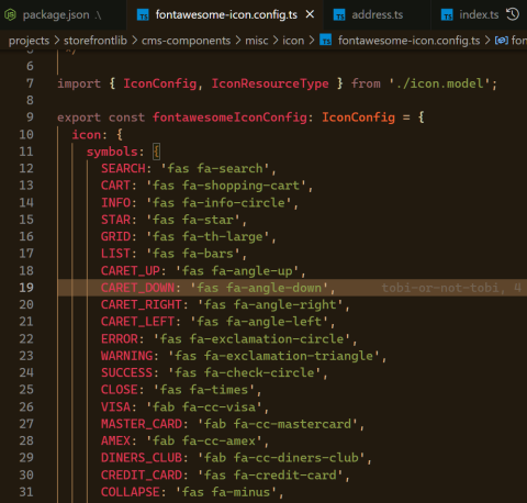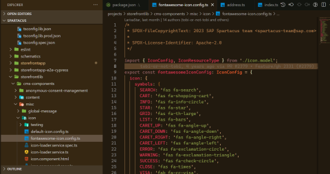 Spartacus 项目中的 fontawesome-icon.config.ts 文件用于配置 FontAwesome 图标的名称和样式,这些图标可以在 Angular 应用程序中使用。该文件定义了一个 FontawesomeIconConfig 类型的常量对象:
