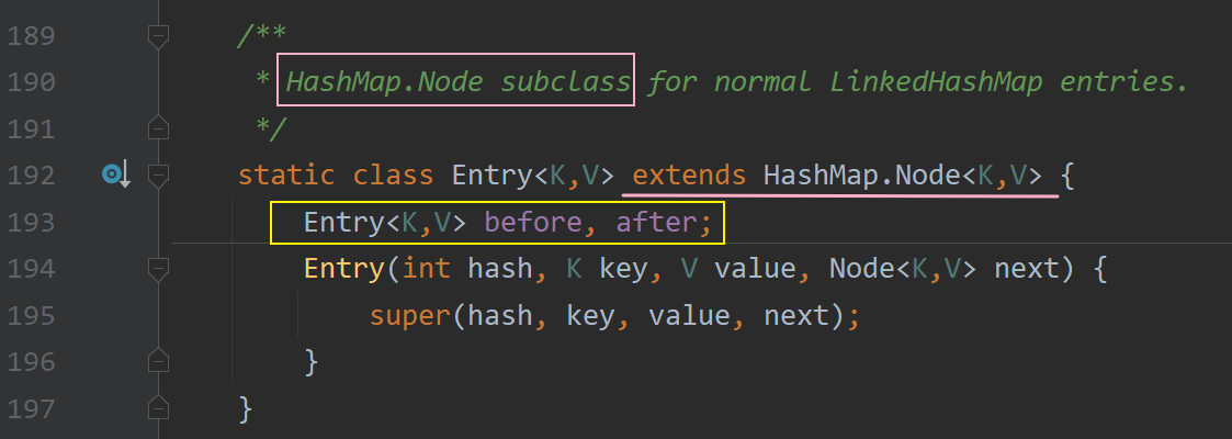 同时要注意,Entry内部类中定义了before和after属性,即我们在上文"LinkedHashSet的底层实现"中提到的——before指向双向链表的前一个结点,after指向双向链表的后一个结点,从而实现双向链表。