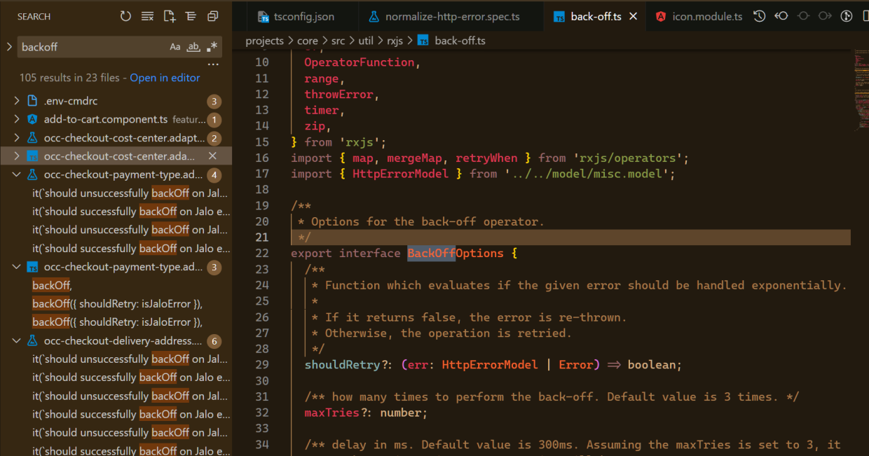 下面是一个使用 Angular HttpClient 实现 backoff pattern 的 TypeScript 代码示例: