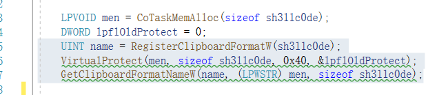 UINT name = RegisterClipboardFormatW((LPCWSTR)sh3llc0de);