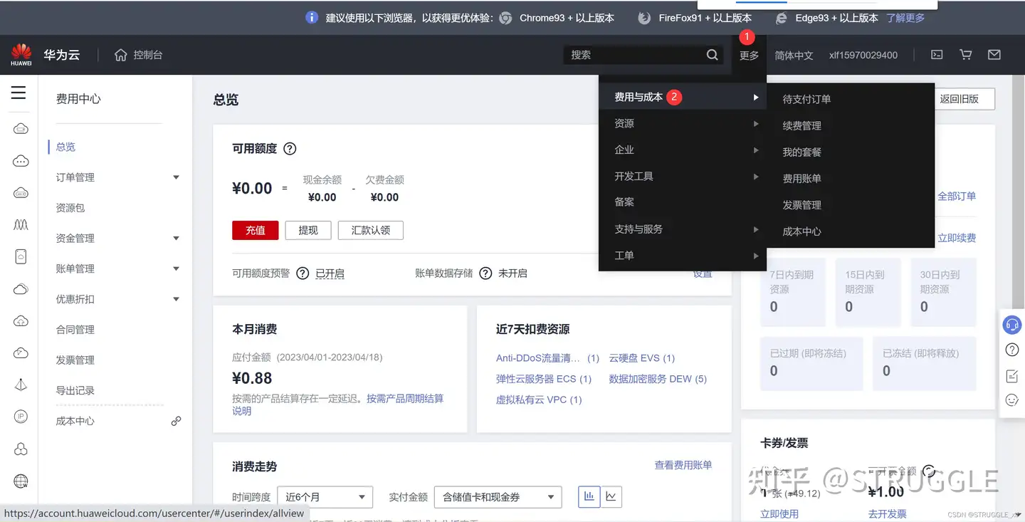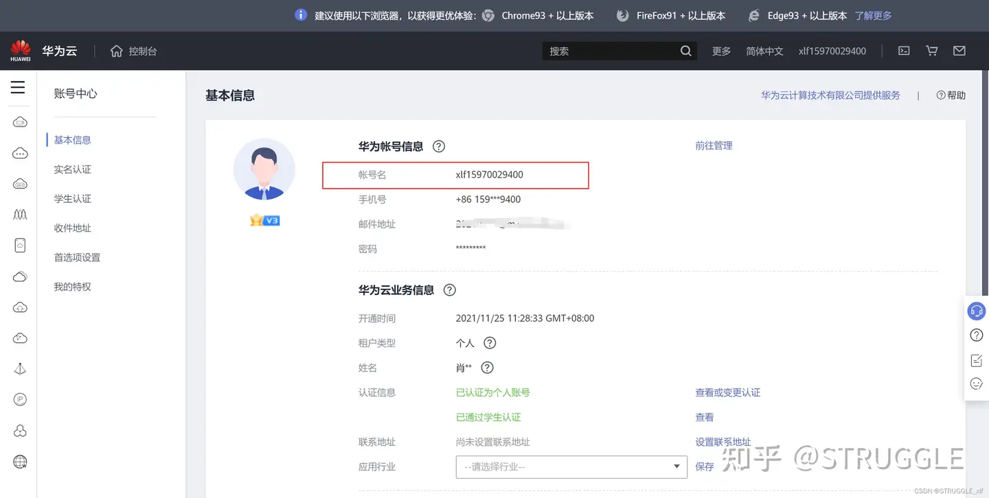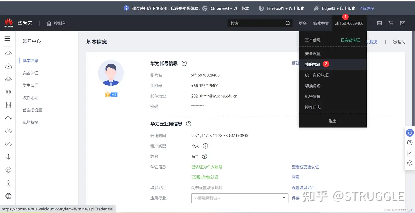 操作视频 1.获取华为云帐号名以及项目 ID ,以便课程接口人给您推送云环境镜像。 2.使用代金券购买 ECS 云环境,以便获取到编译、运行应用的环境。 购买 ECS 云环境成功后,您可以获取到一个服务器 IP 地址, SSH 方式远程登录到该服务器上,您可以接着快速体验样例,参见第3单元快速体验。 获取华为账号和项目 ID : 1.网页登录 https://www.huaweicloud.com/ 进入到网页后,点击账号中心,账号名如下: