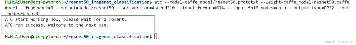 atc --model=caffe_model/resnet50.prototxt --weight=caffe_model/resnet50.caffemodel --framework=0 --output=model/resnet50 --soc_version=Ascend310 --input_format=NCHW --input_fp16_nodes=data --output_type=FP32 --out_nodes=prob:0