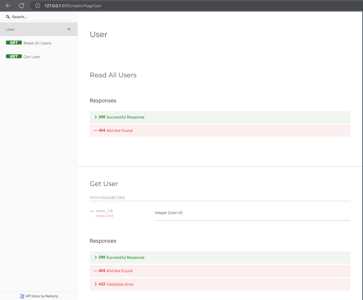 访问 http://127.0.0.1:8000/redoc 会自动帮我们重定向到 User 的接口文档界面: