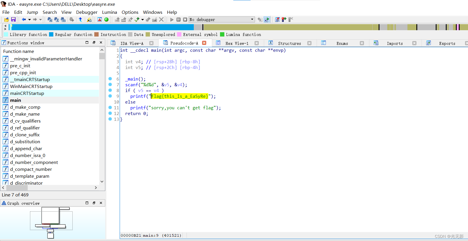 这道简单题没有加壳,看到是64位机上面运行的可执行文件,拖到64位ida上面进行反汇编