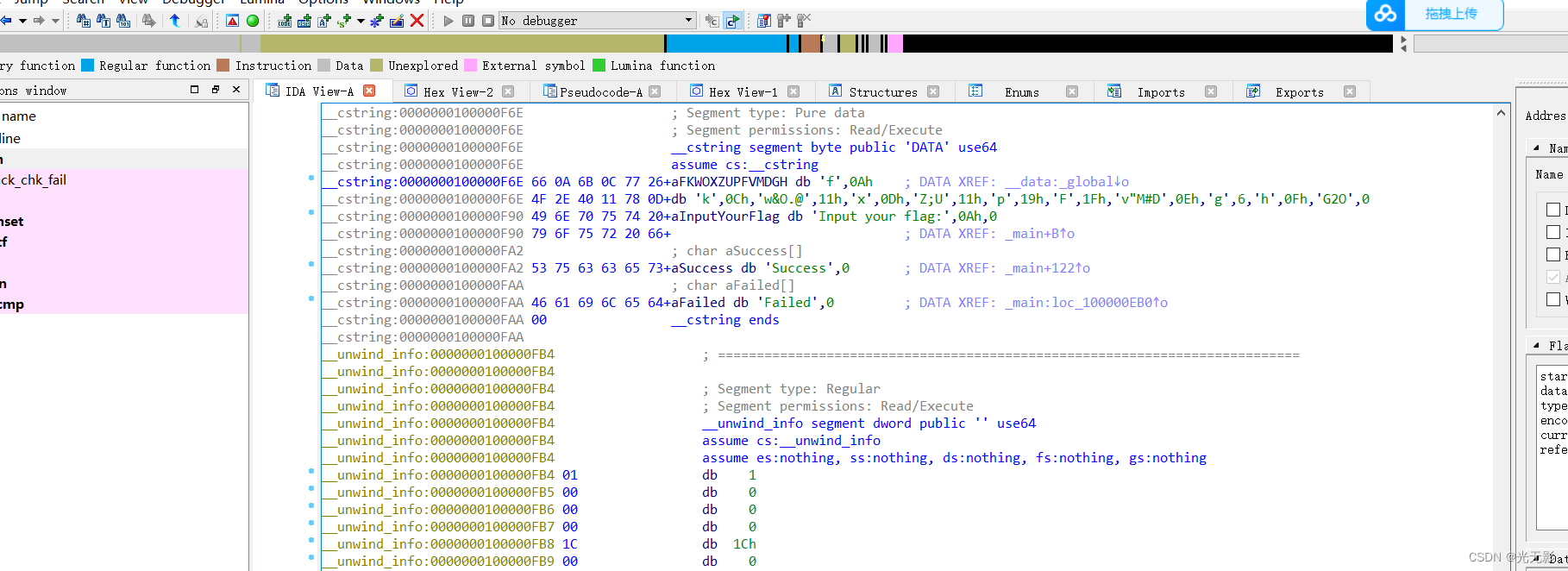 【摘要】 1.解压文件得到文件夹,得到一个__MACOSX,说明是MacOs系统的可执行文件编辑._xor在windows系统中是没用的只需要对xor进行反汇编2.查壳 编辑是一个64位文件3.静态分析找到main函数,按下F5反编译编辑int __cdecl main(int argc, const char **argv, const char **envp){ int i; // [...