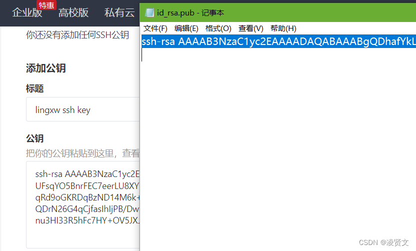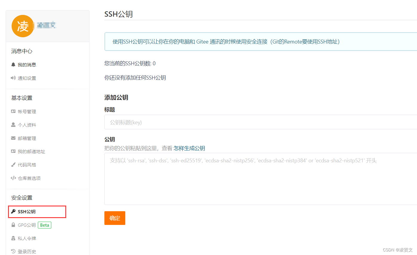 由于我们的本地 git仓库和 gitee仓库之间的传输是通过SSH加密的,所以我们需要配置SSH