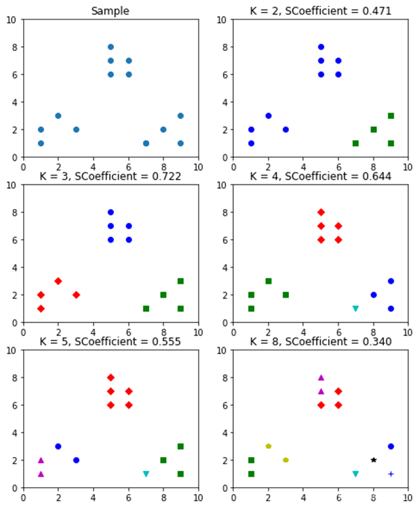 - 使用轮廓系数来确定,选择使系数较大所对应的k值