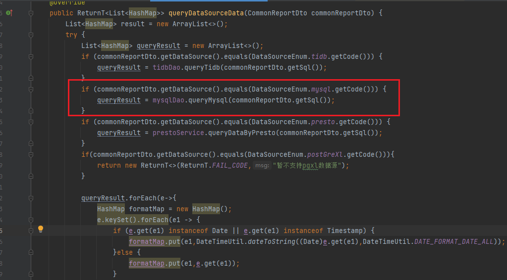 以发现在36行通过@Autowired给mysqlDao自动注入,最后在(queryDataSourceData方