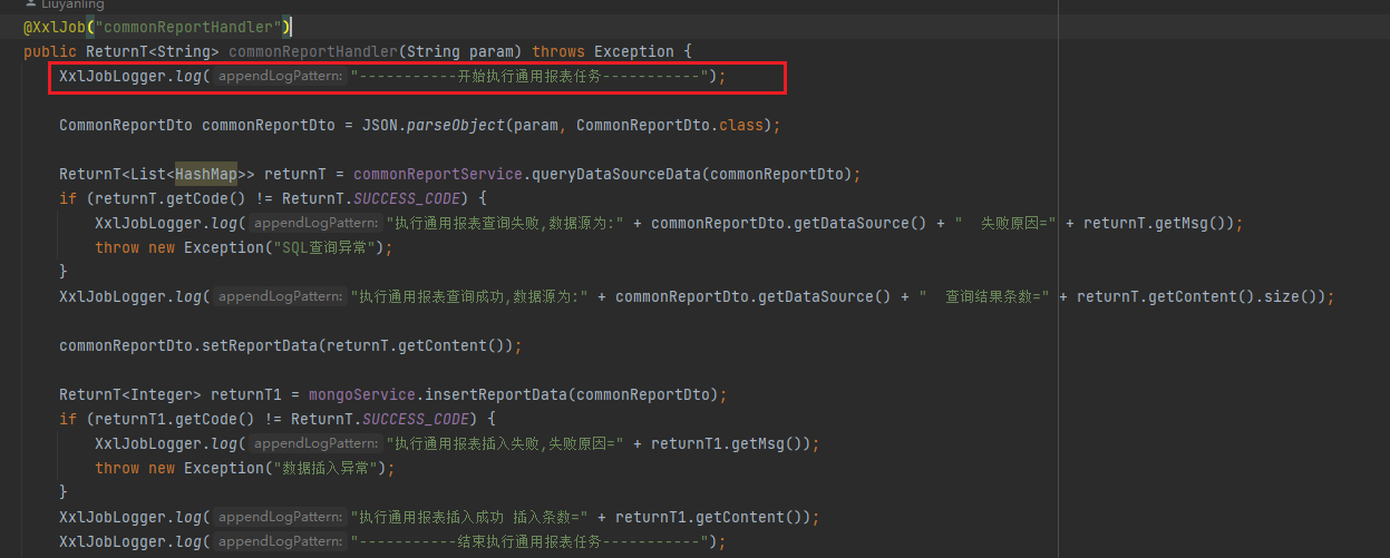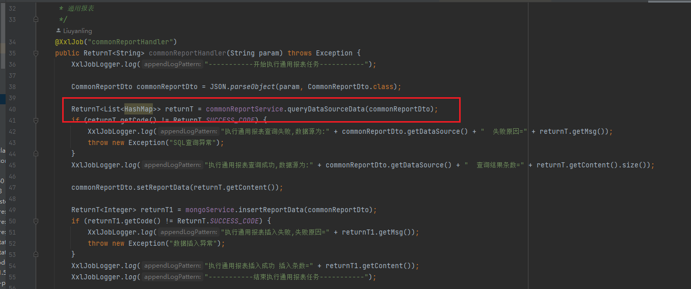 并在95行中会调用到(图2)com/lyl/igreport/service/jobhandler/CommonReportHandler.java类中第40行的commonReportService.queryDataSourceData方法,而该方法就是上方中的Service层