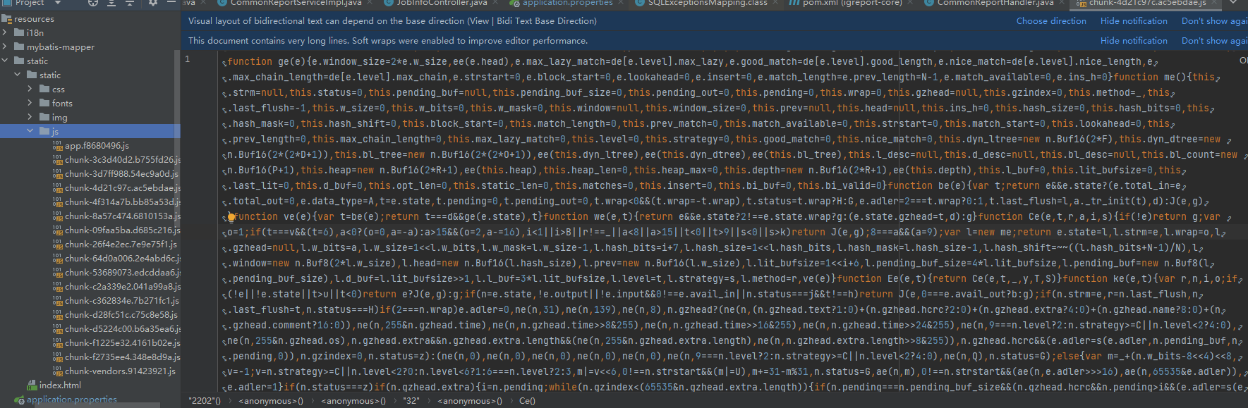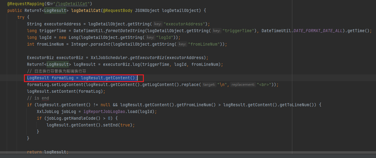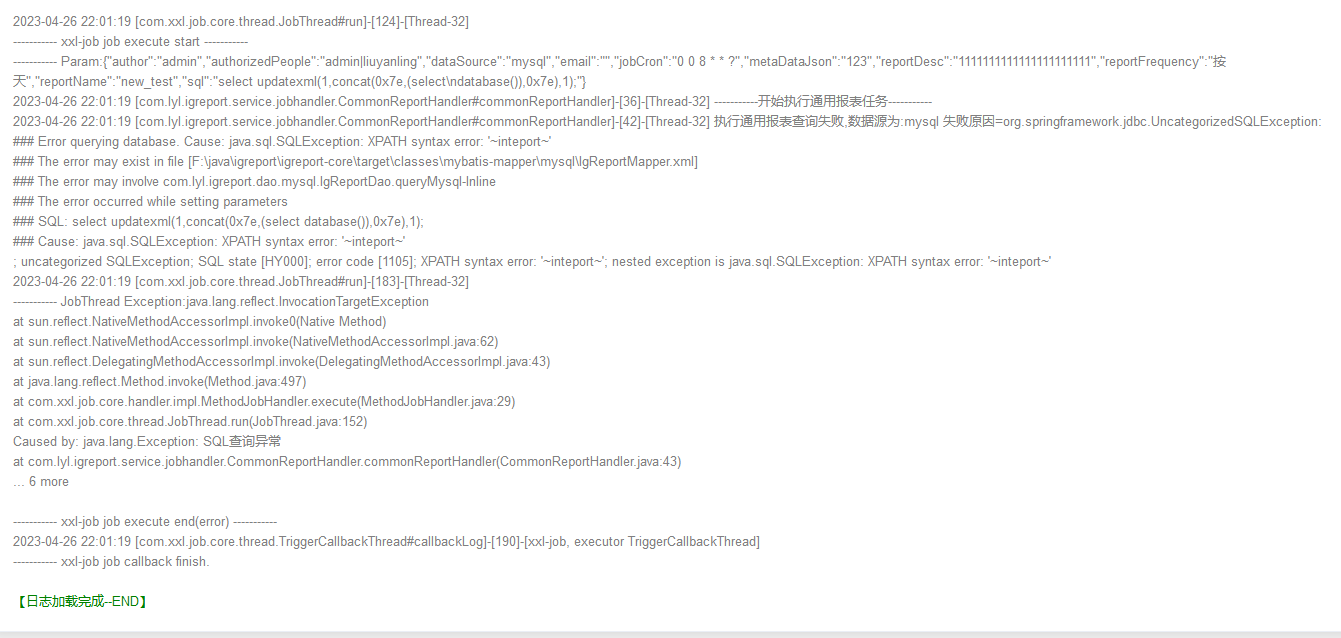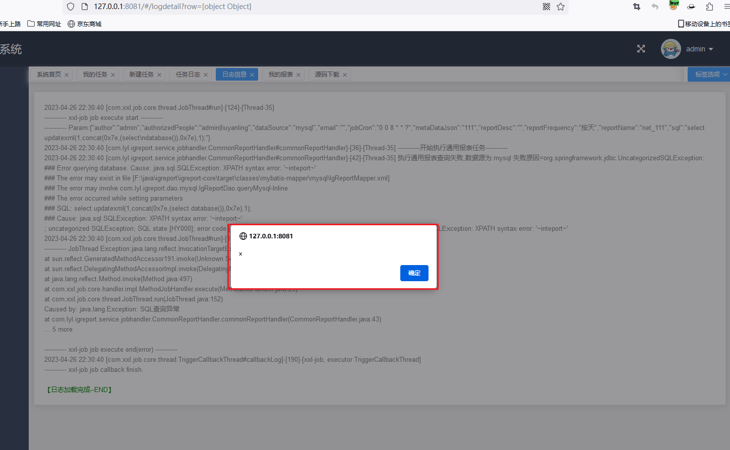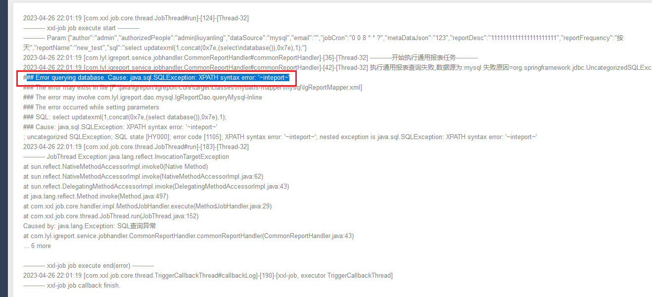 由于该项目采用Springboot+vue的整合,所以XSS的希望渺茫,但是在下方的目录中发现了index.html,所以列出了两种可能 1. index.html会不会存在XSS 2. 在审计SQL注入的时候,发现了CommonReportServiceImpl类中使用了XxlJobLogger.log()将内容进行输出到页面。