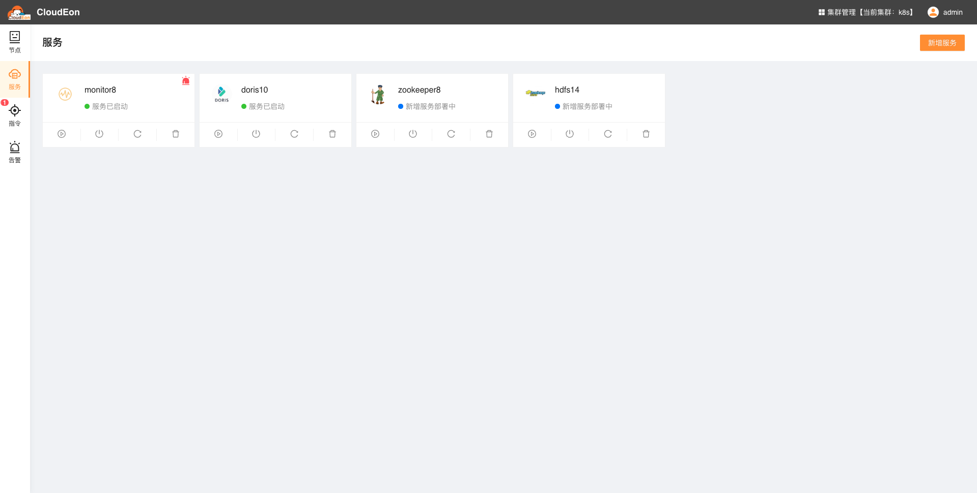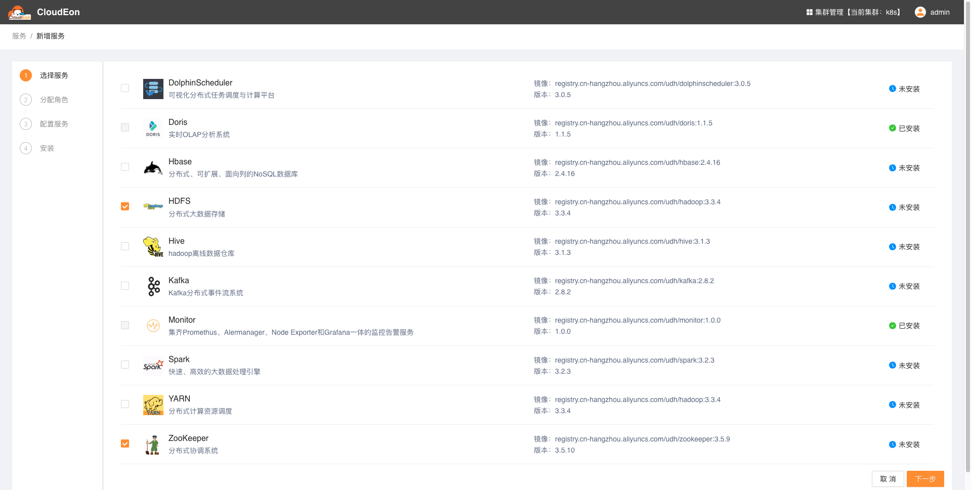 - CloudEon目前已实现在k8s上管理部署大数据服务,包括节点管理、服务角色的重启、启动、停止等操作,还可以进行服务的配置、删除、告警提示以及实时日志查看等功能。支持在Kubernetes上运行多种服务,例如hdfs、yarn、zookeeper、doris、hive、spark、dolphinscheduler、hbase、kafka、prometheus、grafana、alertmanager等。