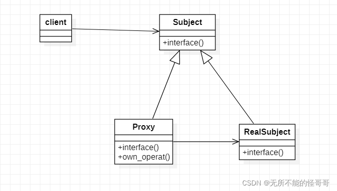 - 抽象主题角色subject:真实主题与代理主题的共同接口,并供客户端使用;