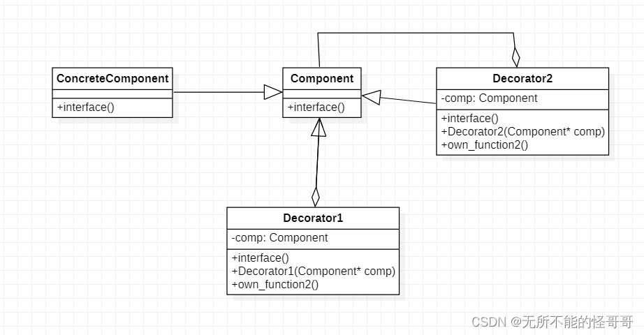 - Decorator:装饰者,继承于Component并从Component类的外部完成对Component类功能的扩充,并且Component类并不需要知道装饰者的存在;