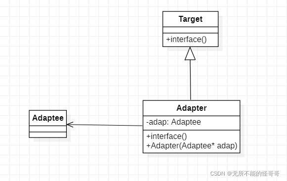 - Adapter:适配器,对Target和Adaptee进行适配,通过在内部包装一个Adaptee对象,来把源接口转换成目标接口;