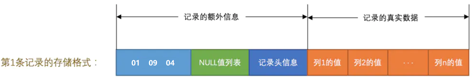 关于记录的额外信息这部分,是服务器为了描述这条记录而不得不额外添加的一些信息,这些额外信息分为3类,分别是变长字段长度列表、NULL值列表和记录头信息。