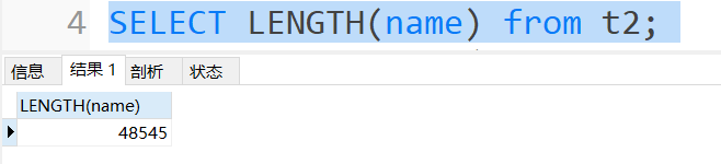 这里48545个字节,再多一个字符就会报错,远不到65535字节,差了1W多字节。主要是因为溢出列的原因,数据分散在不同的行中,所以,很长的数据,建议往text类型考虑。这个现象可以看出,varchar(M)的M很大,实际是达不到M这个边界值的。