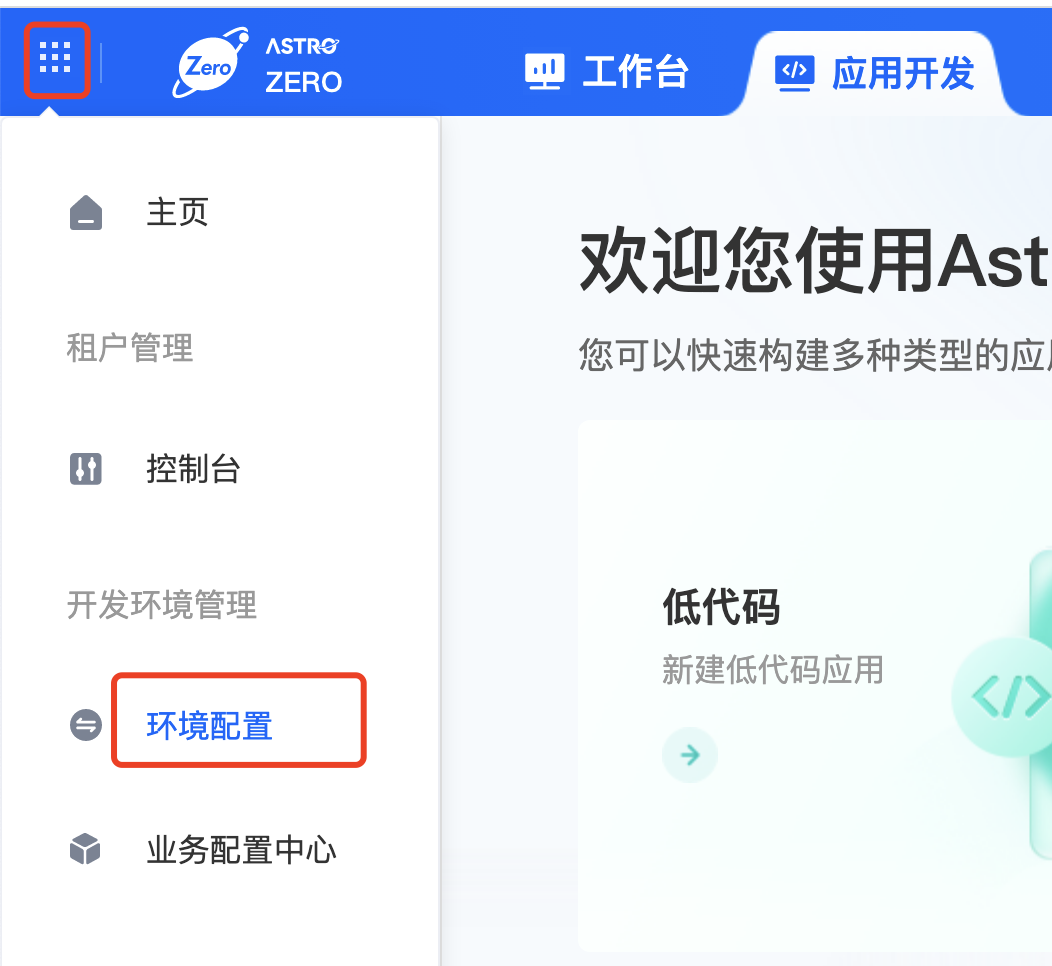 ,选择“开发环境管理 > 环境配置”,进入AstroZero开发环境的环境配置。