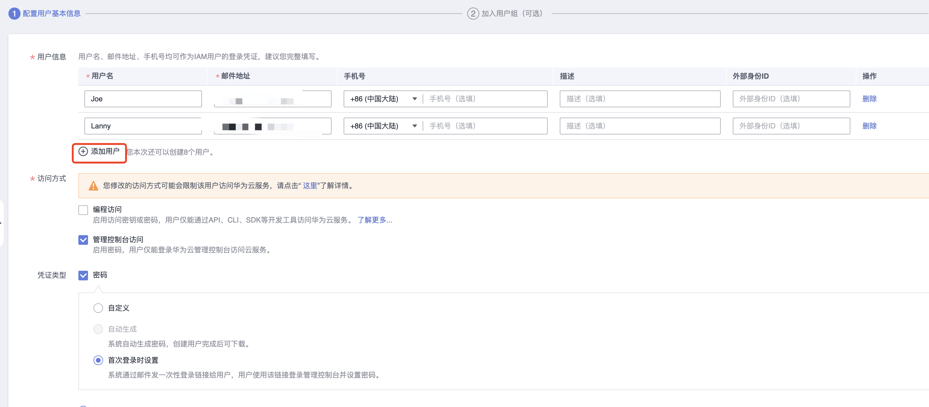 2、华为云是支持一次性创建多个用户,点击添加用户按钮即可。
