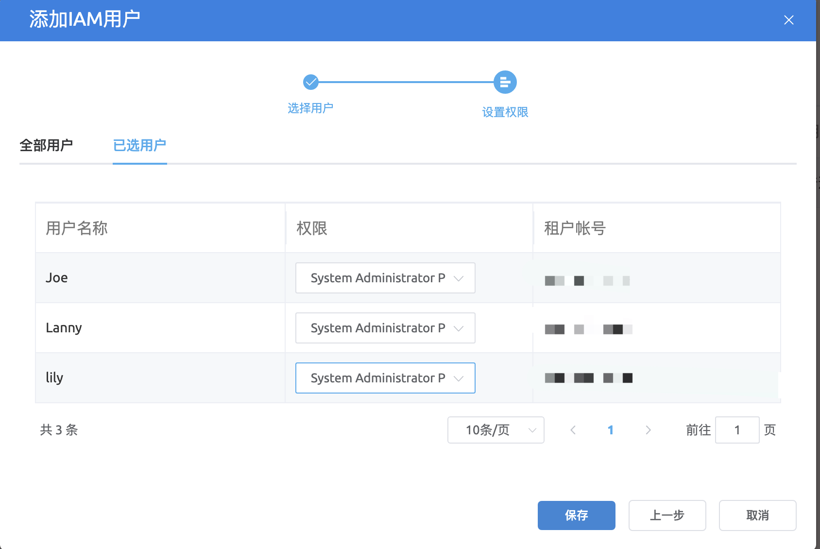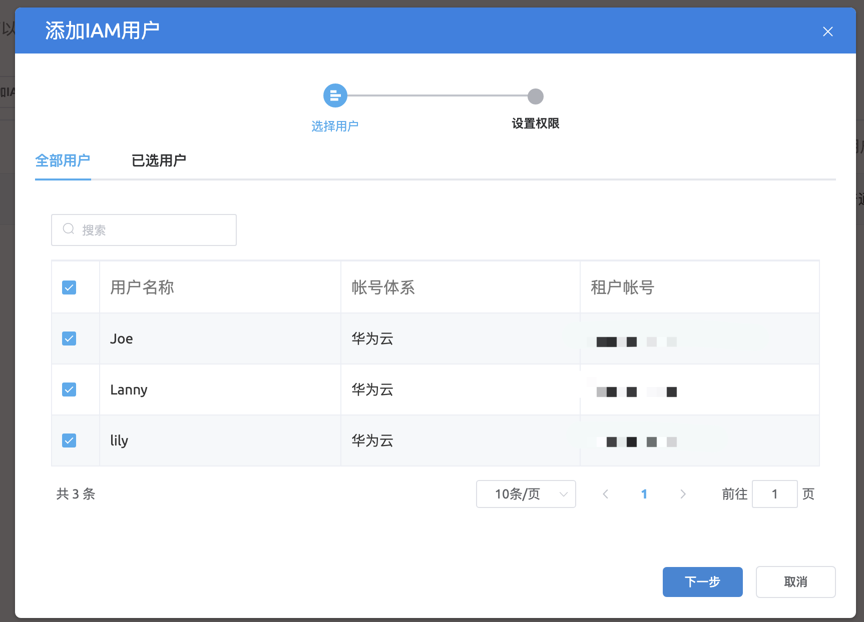 2、在全部用户列表中,选择需要创建的子帐号,单击「下一步」。