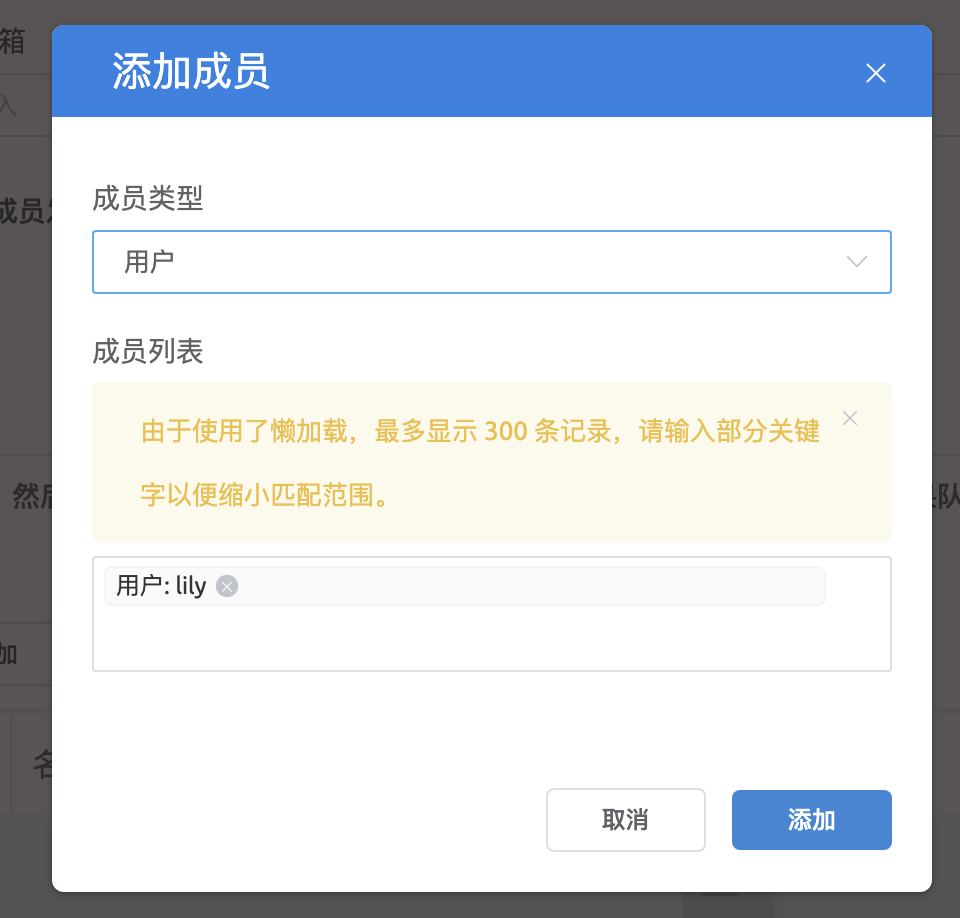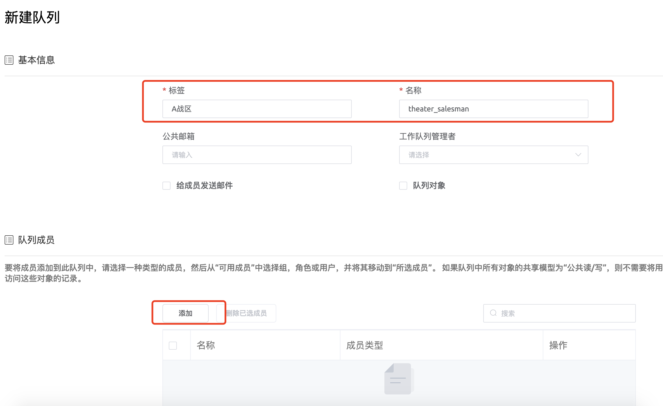 输入标签和名称,然后点击「队列成员」模块中的添加,进行成员添加。