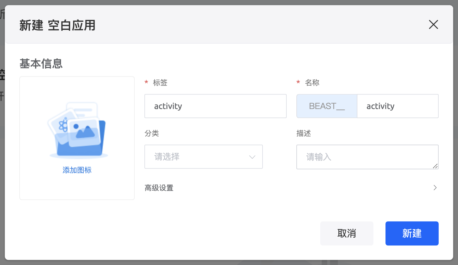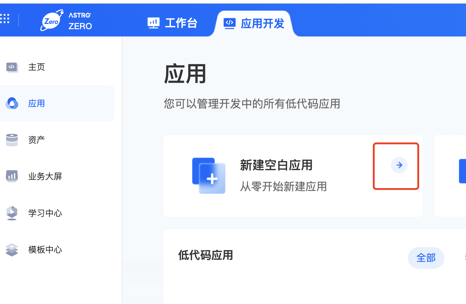 1、单击新建空白应用后的「箭头」,新建空白应用。