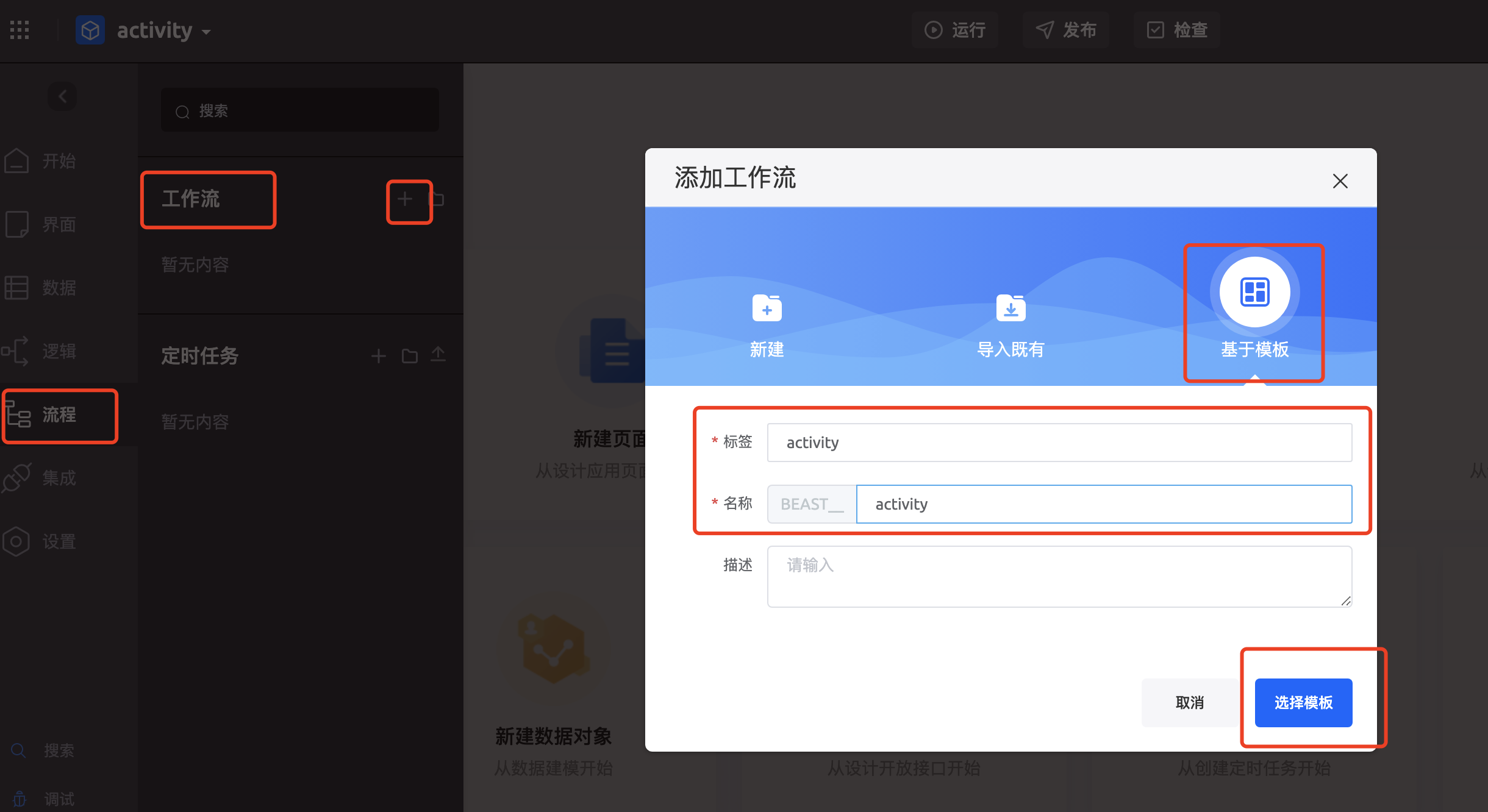 在弹层中,单击「基于模板」,设置标签、名称和描述等信息。